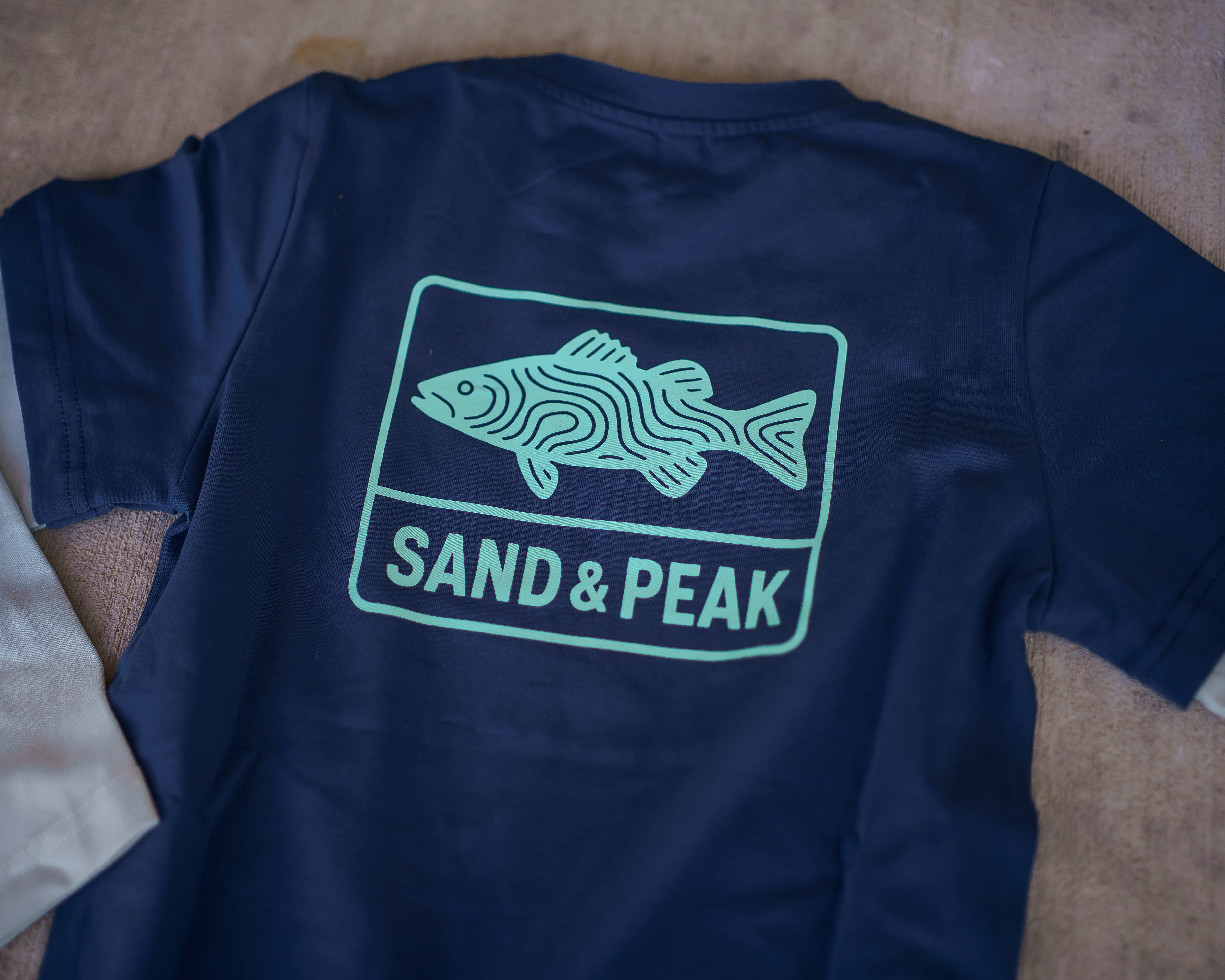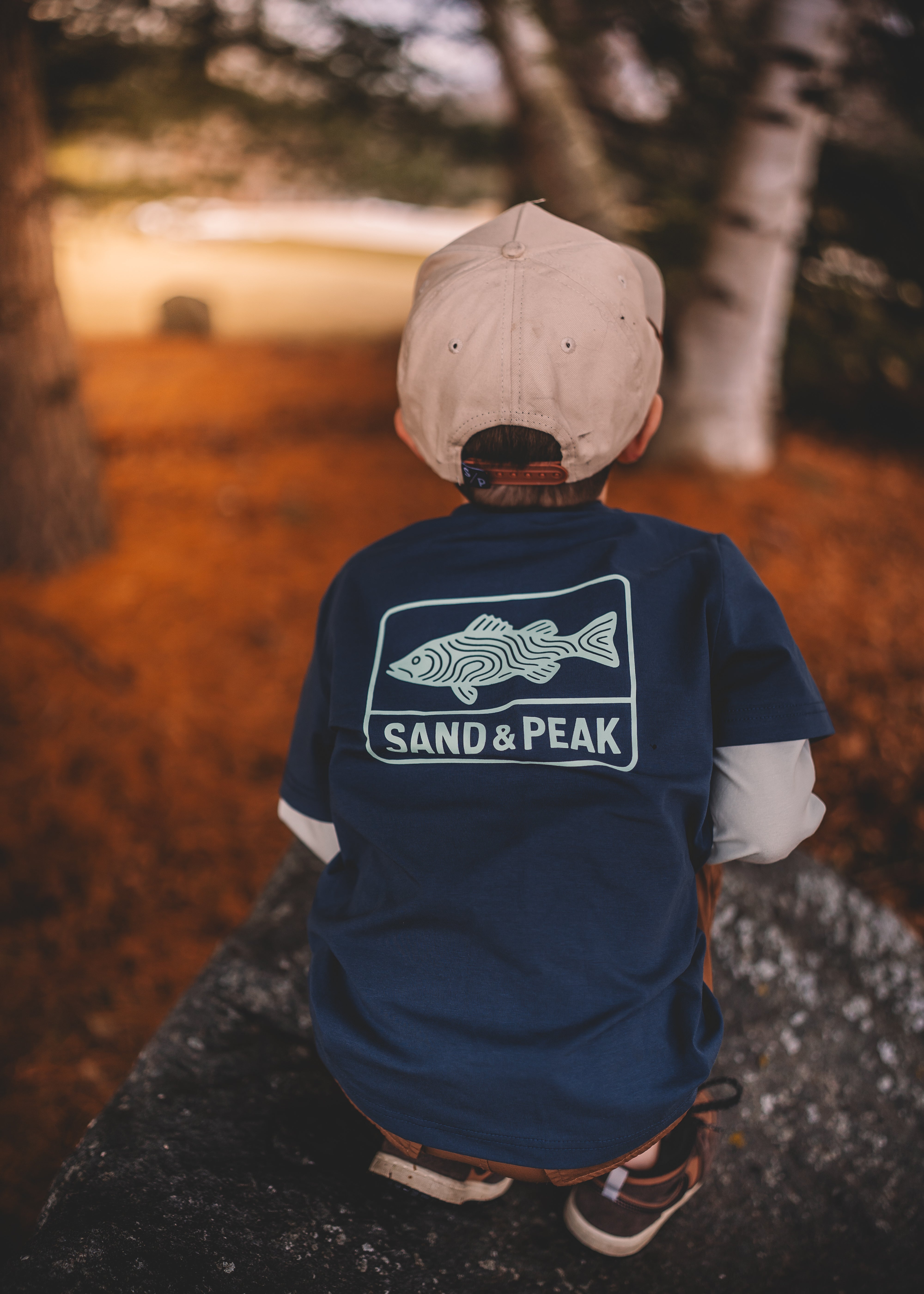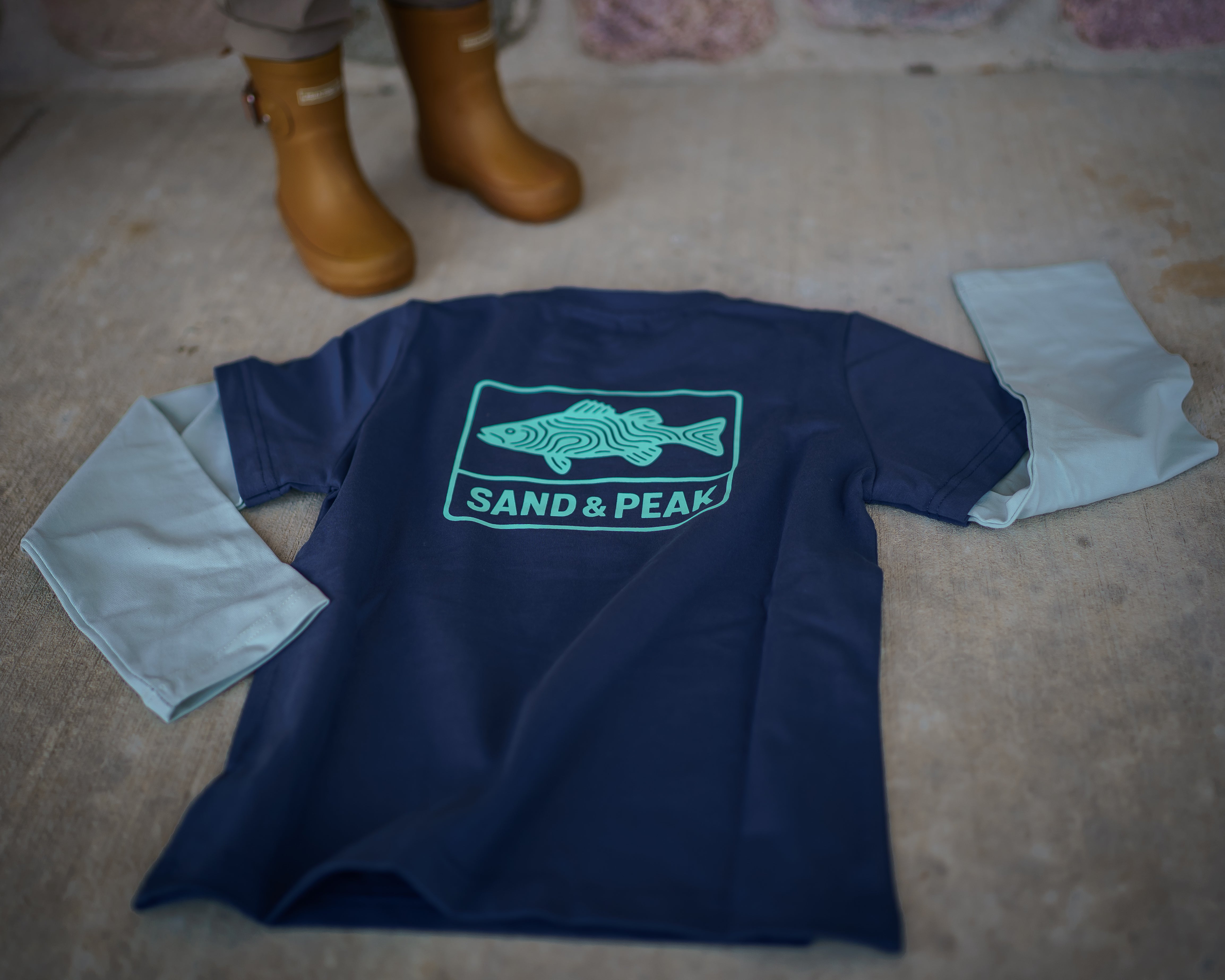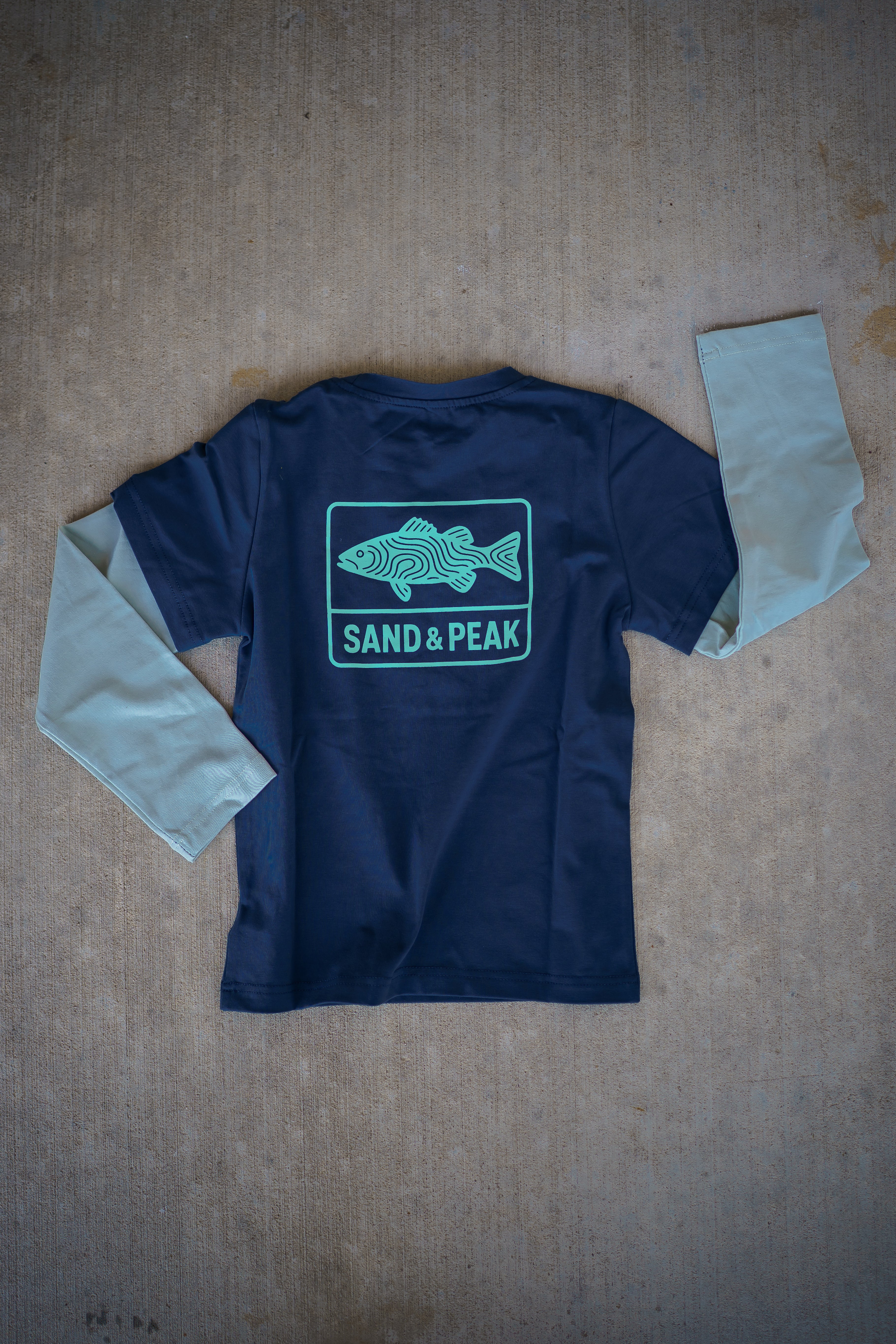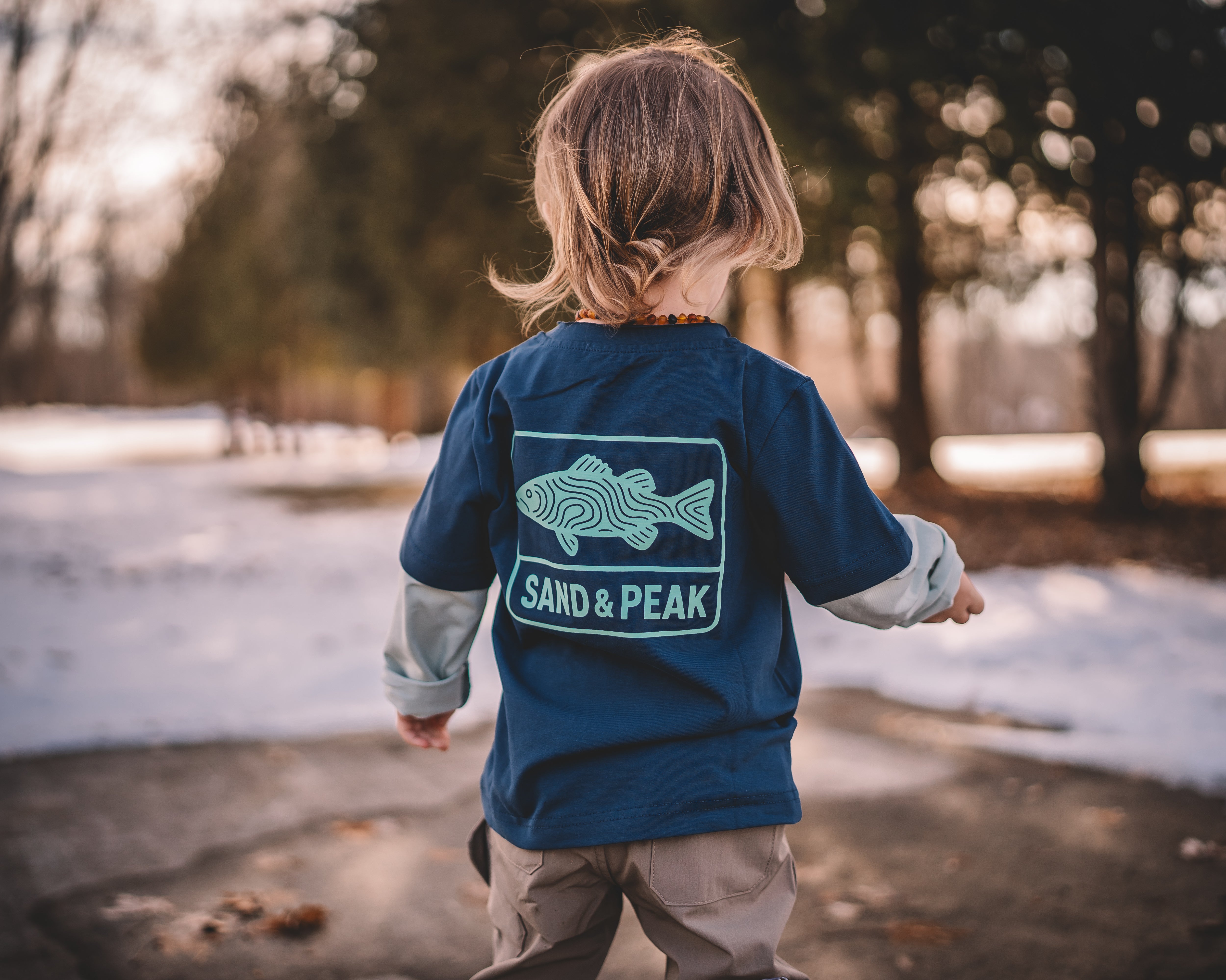 The Saltwater Scout Tee is made for kids who wander a little farther and stay out a little longer. Featuring a layered long-sleeve look with soft contrast sleeves, this tee blends everyday comfort with an outdoors-ready feel. Finished with a bold Sand & Peak fish graphic on the back, it’s a statement piece built for adventure, from shoreline walks to backyard exploring.