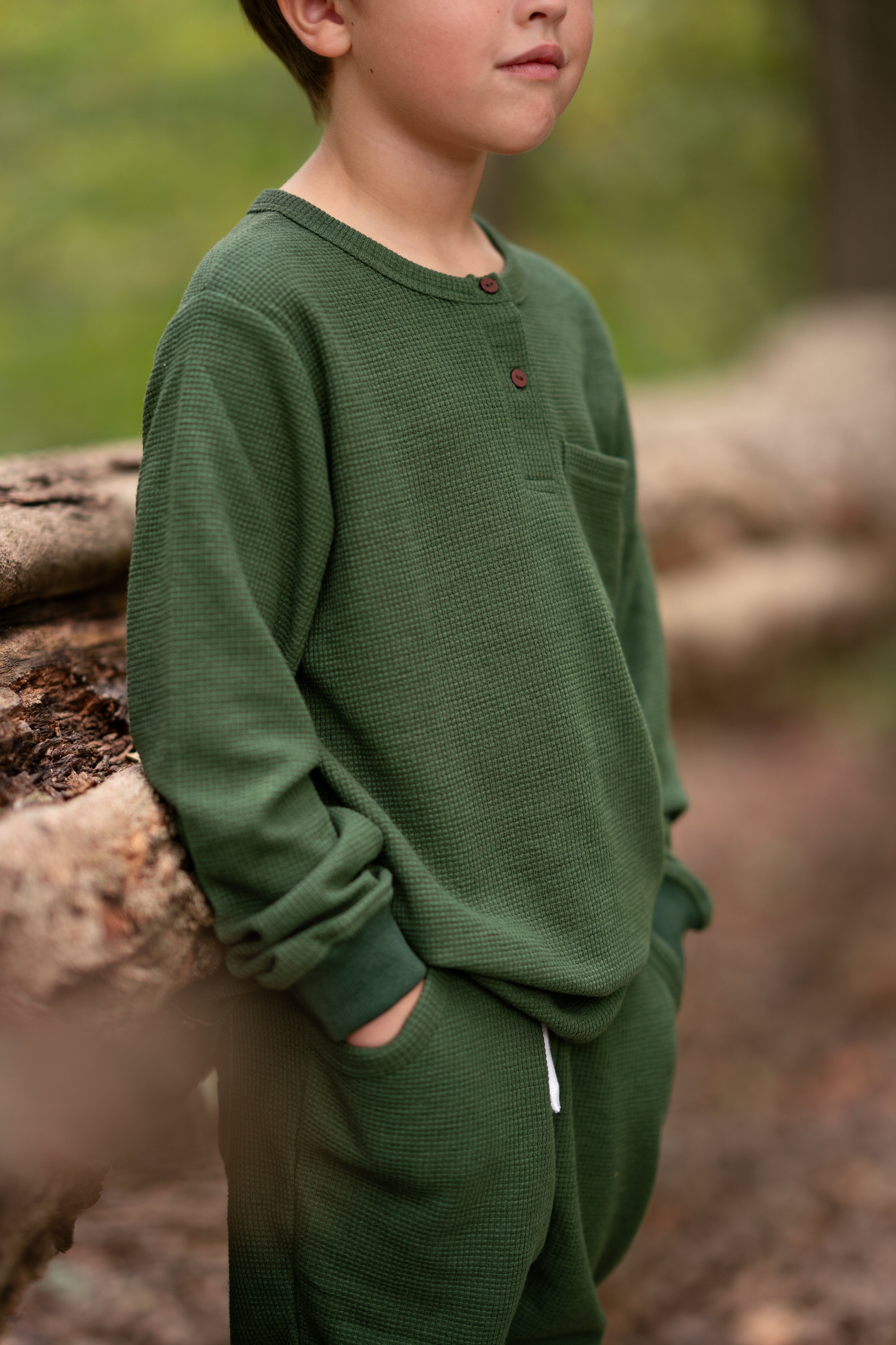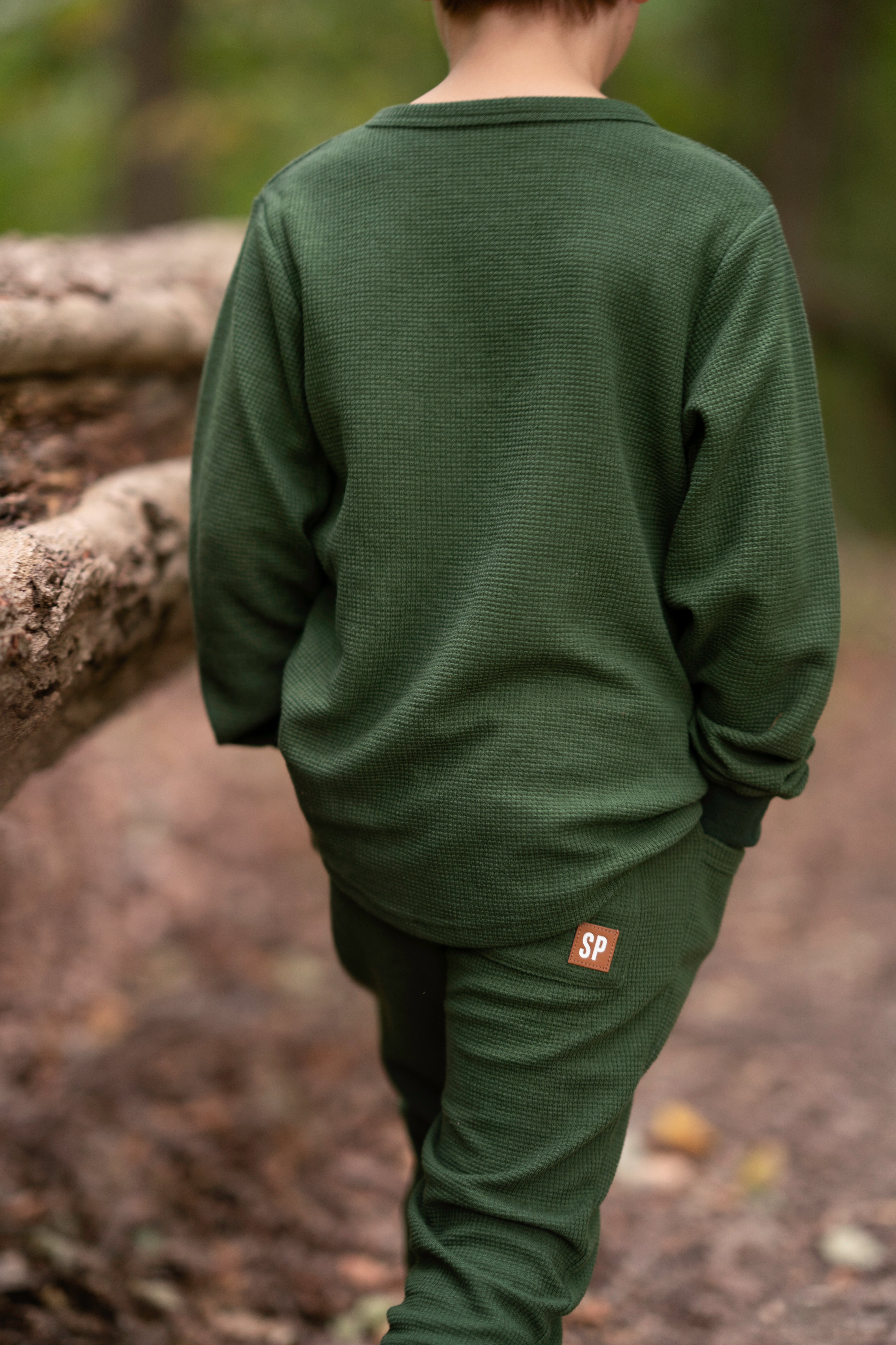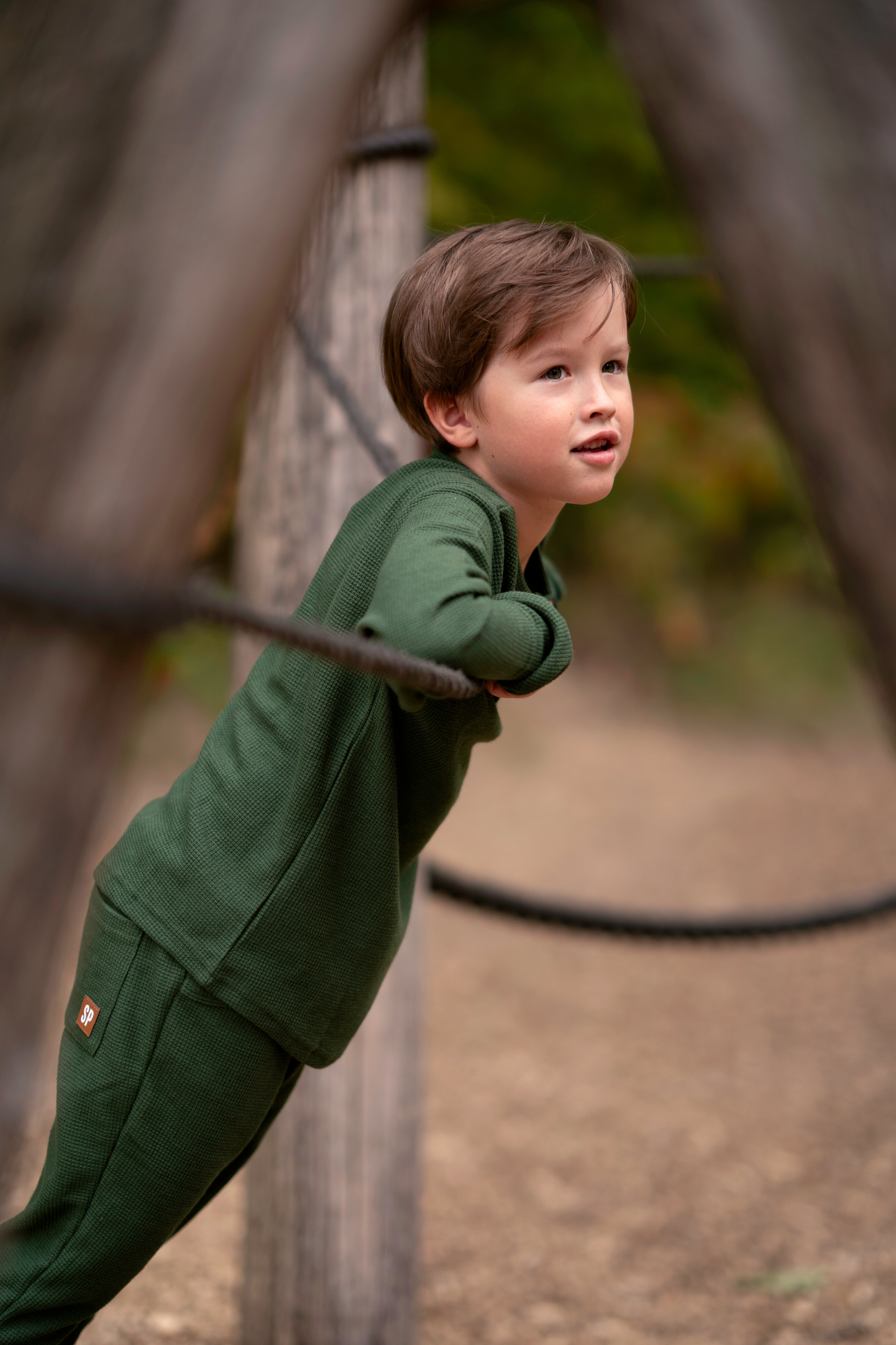 Cozy comfort meets everyday adventure. The Peak Waffle Set is crafted from soft, breathable waffle-knit fabric that keeps little ones warm without overheating. Designed with ribbed cuffs, a functional chest pocket, and easy pull-on joggers, this set is perfect for play, lounging, or layering on cooler days. The deep forest green hue, accented with Sand & Peak’s signature tag, brings a timeless outdoor-inspired look that feels both classic and fresh.