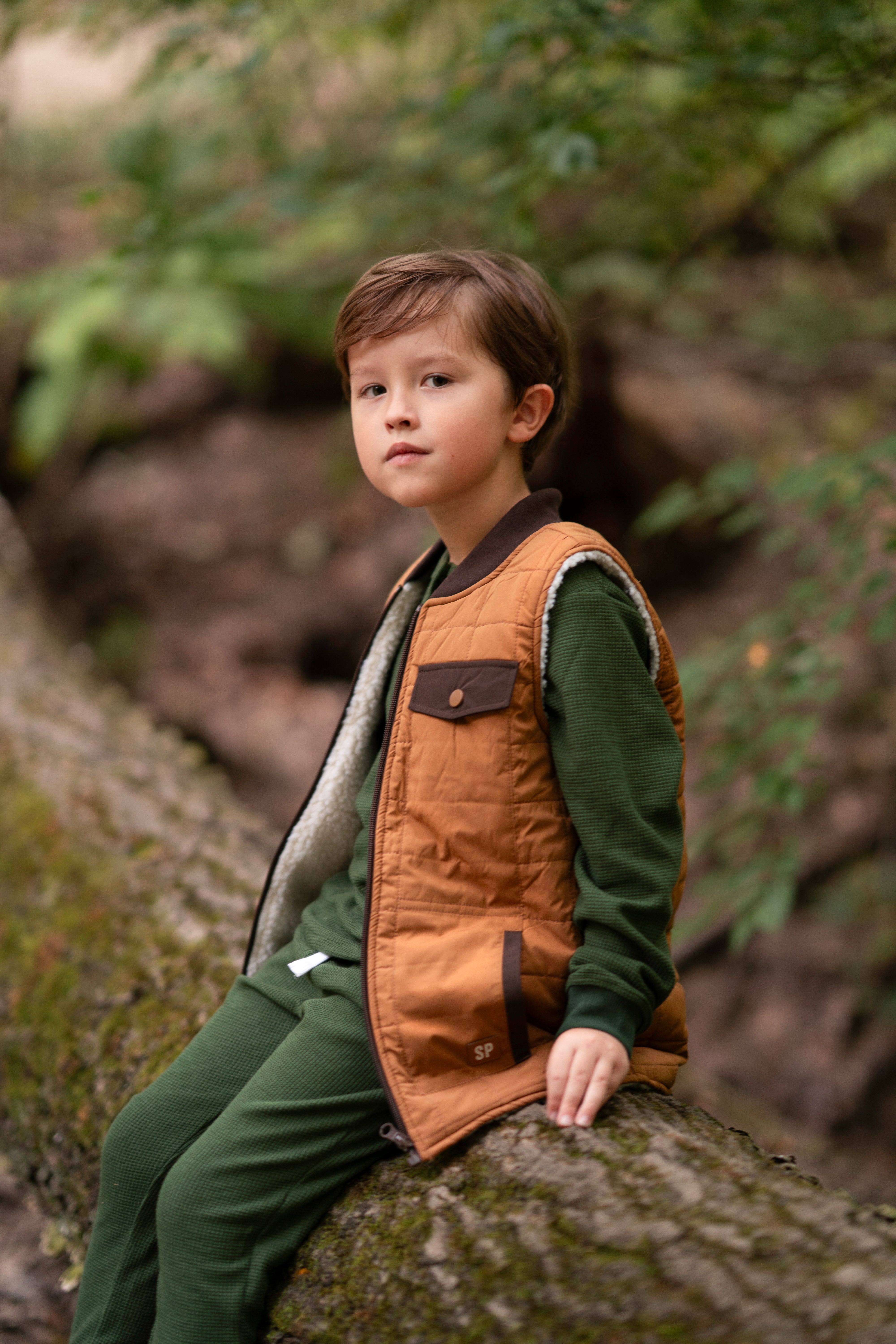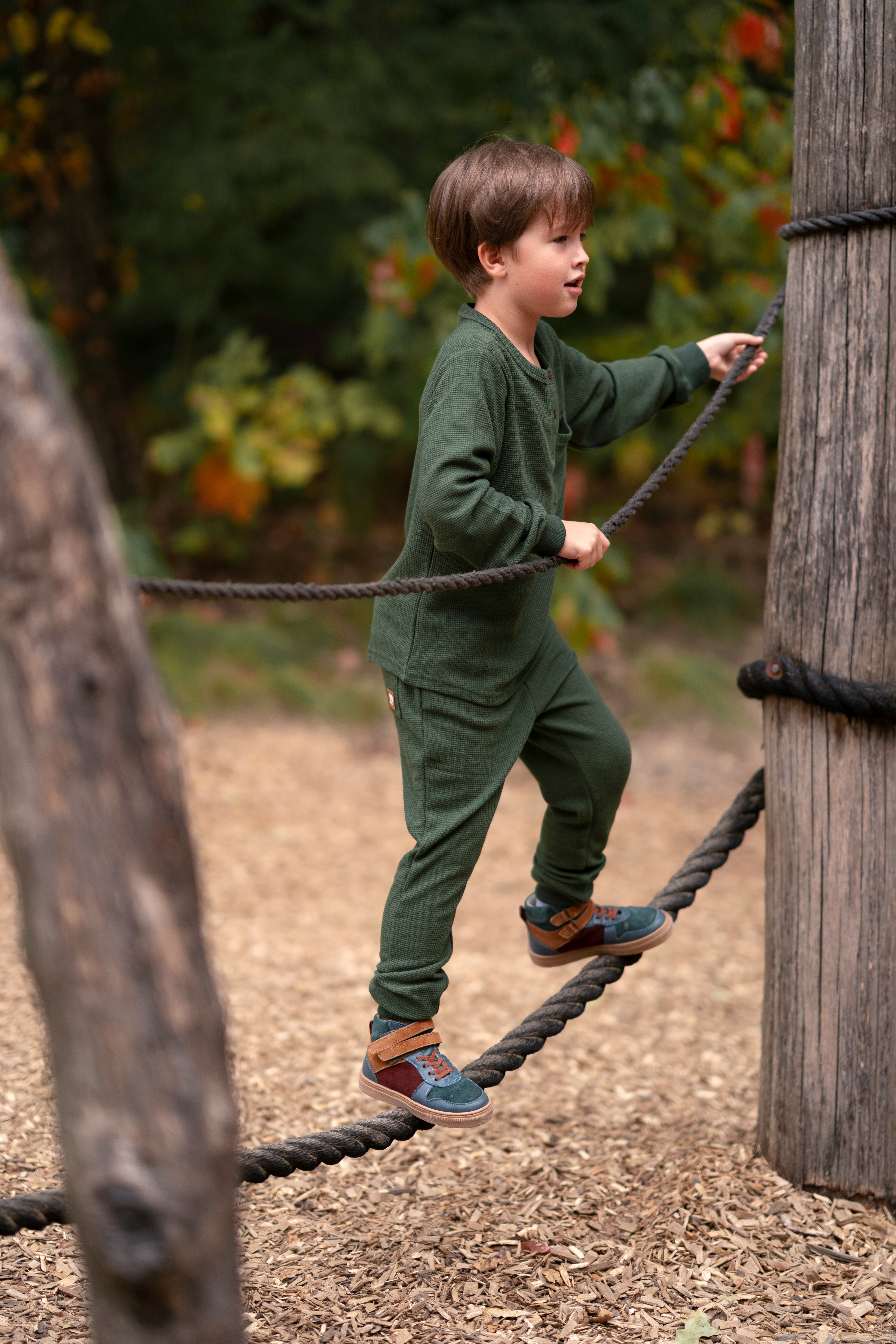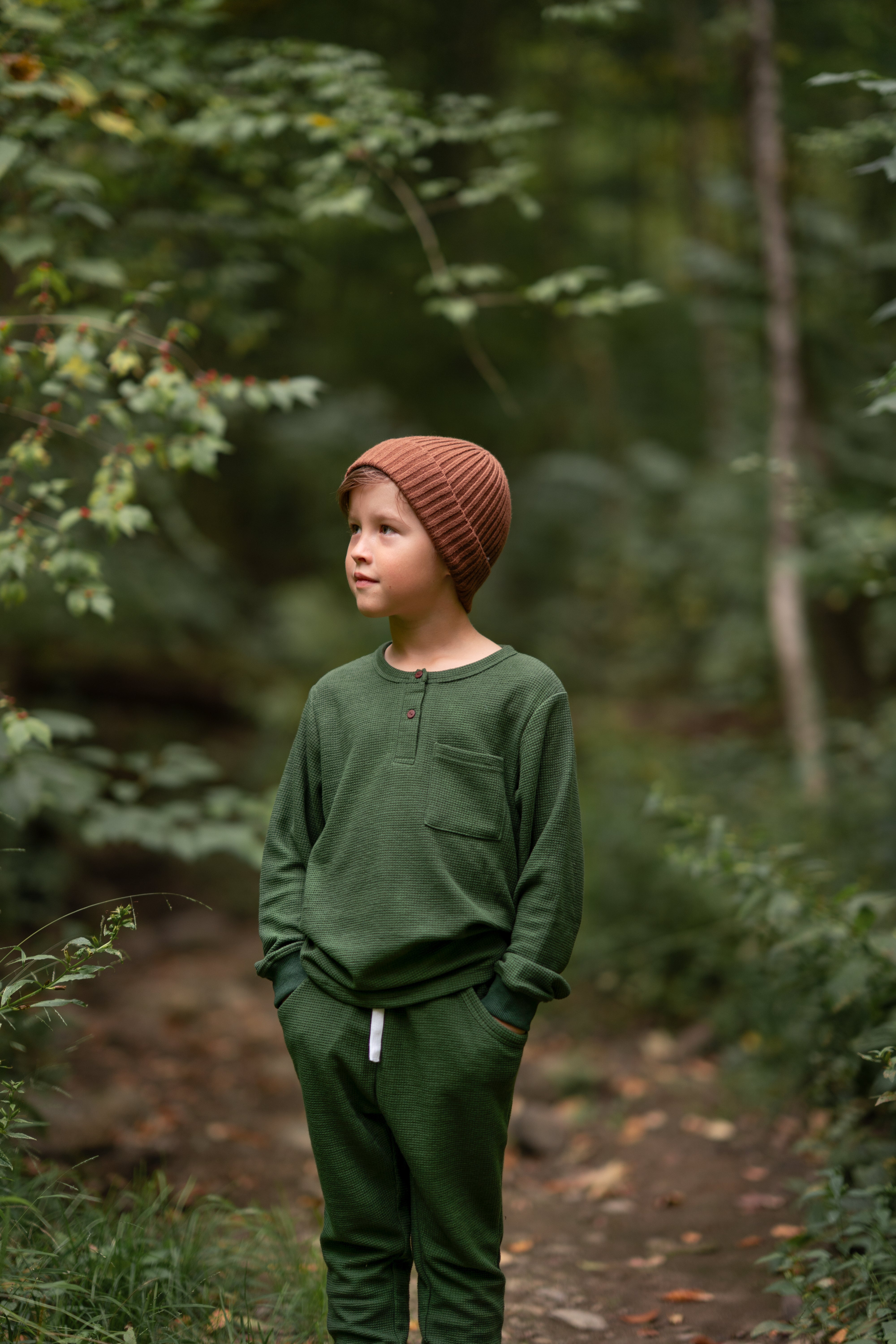 Cozy comfort meets everyday adventure. The Peak Waffle Set is crafted from soft, breathable waffle-knit fabric that keeps little ones warm without overheating. Designed with ribbed cuffs, a functional chest pocket, and easy pull-on joggers, this set is perfect for play, lounging, or layering on cooler days. The deep forest green hue, accented with Sand & Peak’s signature tag, brings a timeless outdoor-inspired look that feels both classic and fresh.